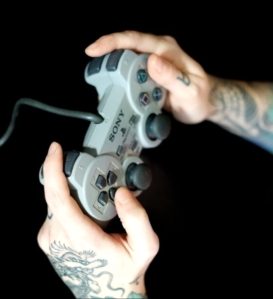 eine alte PlayStation, Anime im Hintergrund, ein CD-Player, der immer läuft.